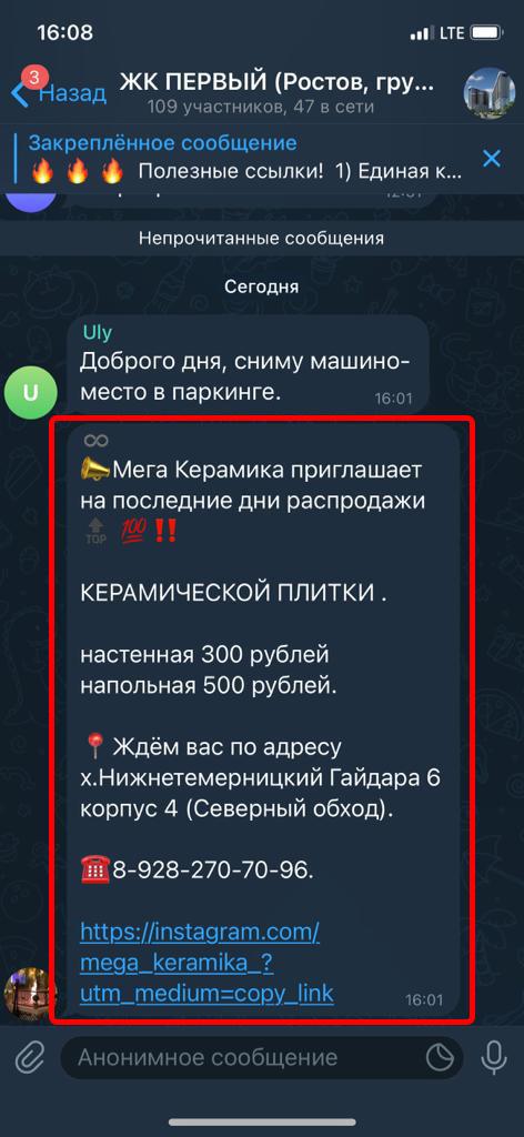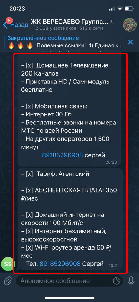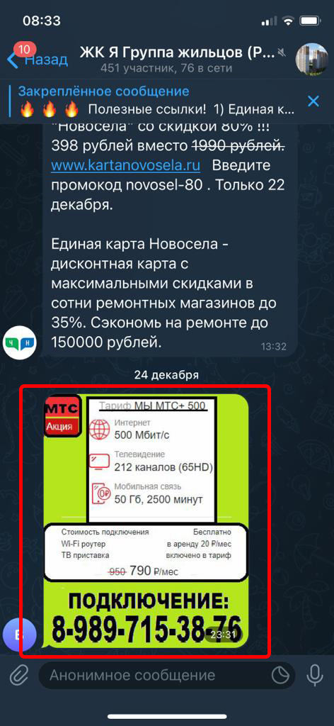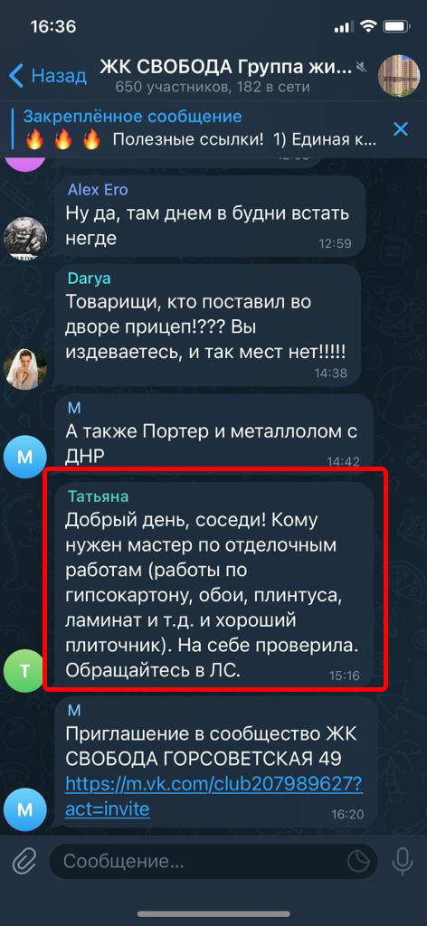 Реклама размещается в группах (чатах) жильцов в Телеграмм. Реклама закрепляется вверху каждой группы на месяц. Каждый пользователь заходя в группу постоянно видит закрепленное сообщение.
